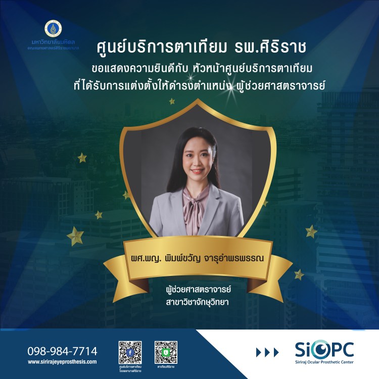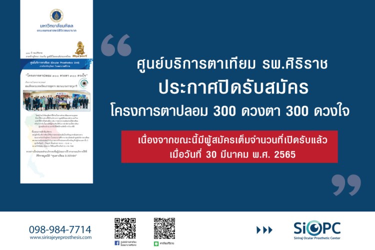 ศูนย์บริการตาเทียมรพ.ศิริราชมอบสิทธิทำตาเทียมเฉพาะบุคคล ภายใต้โครงการตาปลอม 300 ดวงตา 300 ดวงใจ เต็มจำนวนที่เปิดรับแล้ว เมื่อวันที่ 30 มีนาคม พ.ศ. 2565 (ทั้งนี้ได้รวมจำนวนผู้ป่วยที่มีนัดพิมพ์ตาที่ศูนย์ฯแล้วแต่ยังไม่ถึงคิวหรือได้รับการประเมินแล้วแต่ยังรอคิวผ่าตัดที่ รพ. ศิริราชก่อนพิมพ์ตา)