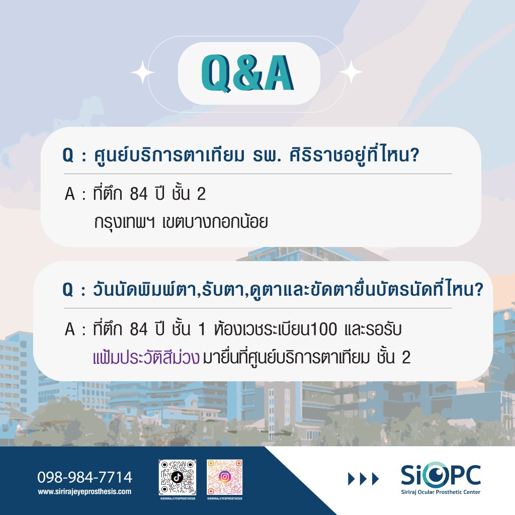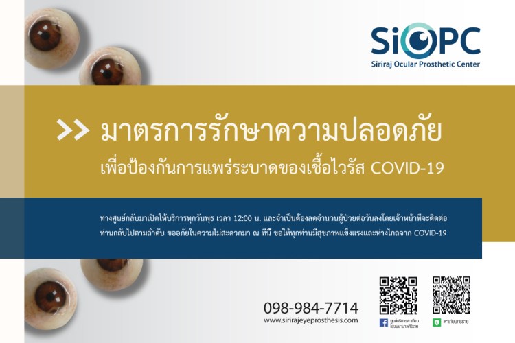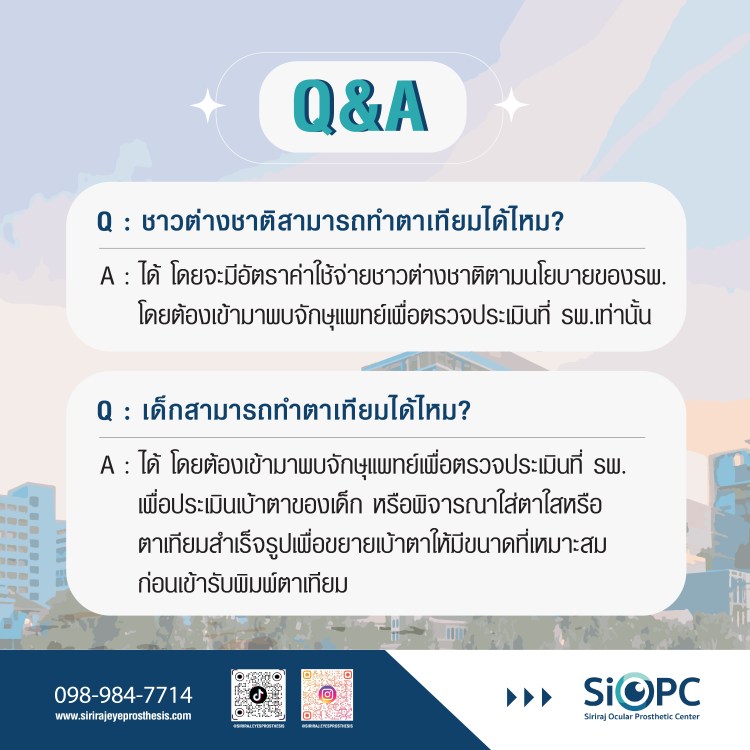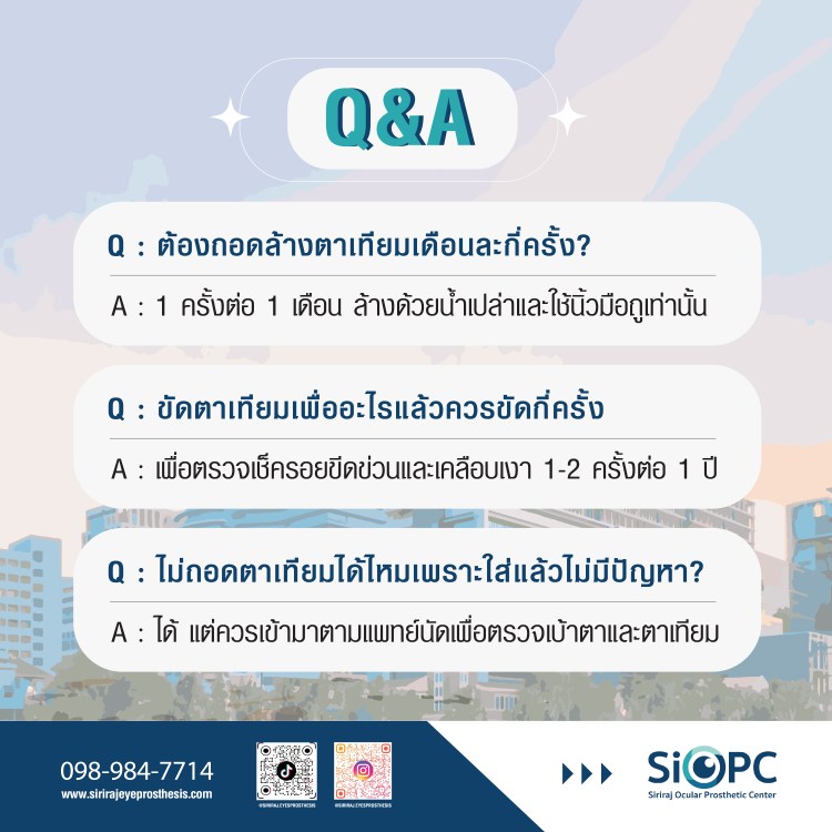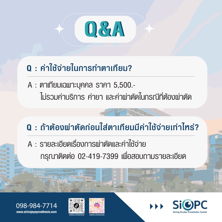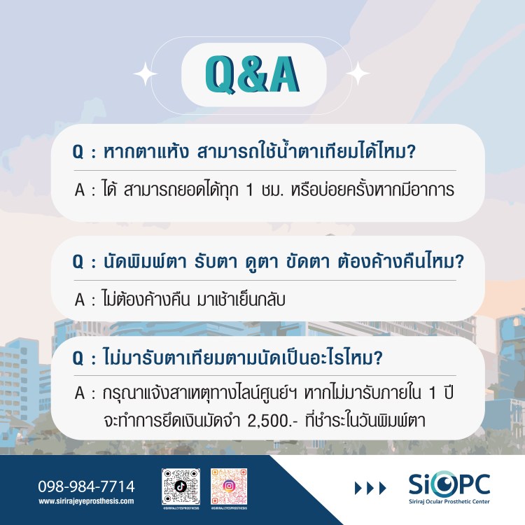 บทความและคำถามที่พบบ่อย มาตรการรักษาความปลอดภัยของศูนย์ตาเทียม >>> อ่านต่อ การผ่าตัดเบ้าตาคืออะไร และมีขั้นตอนอย่างไรบ้าง ?>>> อ่านต่อ ทำตาเทียมเฉพาะบุคคลต้องมาหาหมอกี่ครั้ง >>> อ่านต่อ ทำเบ้าตาเทียม ต้องมาหาหมอทั้งหมดกี่ครั้ง >>> อ่านต่อ อยากทำนัดตาเทียม ต้องทำอย่างไร >>> อ่านต่อ กรณีไหนบ้างที่ต้องผ่าตัดเบ้าตาก่อนทำ >>>อ่านต่อ เตรียมตัวก่อนเข้ารับการพิมพ์ตา >>> อ่านต่อ ทำอย่างไรดี? พบปัญหาตาเทียมหลุด >>> อ่านต่อ ใส่ตาเทียมแล้วไม่มีปัญหาไม่ไปตามนัด >> อ่านต่อ มาทำตาเทียมต้องนำเอกสารอะไร >>> อ่านต่อ ตาเทียมที่ดี ควรเป็นอย่างไร >>> อ่านต่อ ไม่ได้ถอดตาเทียมจะมีผลข้างเคียงไหม >>> อ่านต่อ เด็กเล็กต้องเปลี่ยนตาเทียมบ่อย… >>> อ่านต่อ วัยเก๋ากับตาเทียมเฉพาะบุคคล >>> อ่านต่อ นัดพิมพ์ตา รับตา ขัดตา ไม่ต้องนอนค้าง >>> อ่านต่อ ส่งตาเทียมทางไปรษณีย์ได้ไหม >>> อ่านต่อ อยากทำตาปลอม ทำไมต้องตรวจประเมินเบ้าตา >> อ่านต่อ อุปกรณ์ช่วยถอดตาเทียม สำหรับผู้ที่ถอดตาเทียมเองได้ยาก >>> อ่านต่อ ลักษณะขี้ตาแบบไหนที่ไม่ปรกติ >>> อ่านต่อ ตาบอดในเด็กสังเกตอย่างไร? >>> อ่านต่อ เด็กทำตาเทียมเฉพาะบุคคลได้ไหม >>>อ่านต่อ ทำตาเทียมระหว่างรอใส่อะไรกลับ >>> อ่านต่อ ไม่เคยใส่ตาเทียม ทำตาเทียมได้ไหม >>> อ่านต่อ ถ้าทำตาเทียมหาย ทำใหม่ได้ไหม >>> อ่านต่อ แก้ไขตาเทียมด้วยตนเองได้ไหม >>> อ่านต่อ คราบกาวด้านหลังเบ้าตาเทียม ทำความสะอาดยังไง >>> อ่านต่อ ไม่ใส่ตาเทียมไปนานๆ ส่งผลอย่างไร? >>> อ่านต่อ รูปทรงด้านหลังตาเทียมไม่เหมือนกัน >>> อ่านต่อ ขี้ตามากหลังใส่ตาเทียม เกิดจากอะไร >>> อ่านต่อ ใส่ตาปลอมแล้วเจ็บตา แก้ไขตาเองได้ไหม >>> อ่านต่อ ถอดล้างตาเทียมเองแล้วทำไมต้องขัดตา? >>> อ่านต่อ ตาเทียมควรถอดล้างกี่ครั้งใน 1 เดือน? >>> อ่านต่อ ตาเทียมแบบไหนที่ห้ามใส่เด็ดขาด >>> อ่านต่อ ใส่ตาปลอมสำเร็จรุปไปนานๆ อาจเกิดปัญหาอะไรได้บ้าง >> อ่านต่อ อยากเลื่อนนัดศูนย์ตาเทียม >>> อ่านต่อ ใส่ตาปลอมขนาดใหญ่กว่าร่องตาจะส่งผลเสียอย่างไร? >>> อ่านต่อ ตาเทียมสำเร็จรูป VS ตาเทียมเฉพาะบุคคลแตกต่างกันอย่างไร? >>> อ่านต่อ 6 วิธีการง่ายๆ ในการดูแลตาเทียม >>> อ่านต่อ ปฏิบัติอย่างไร เมื่อต้องวัดสีดวงตา? >>> อ่านต่อ เมื่อไหร่ที่ควรใช้น้ำตาเทียม >>> อ่านต่อ ดูแลดวงตาด้วยการเช็ดตาอย่างถูกวิธี >>> อ่านต่อ ทำอย่างไรดี เมื่อมีสิ่งแปลกปลอมเข้าตา? >>> อ่านต่อ ไขข้อสงสัย? เลือกแว่นนิรภัย เลนส์แว่นสีไหนเหมาะกับคุณ >>> อ่านต่อ รู้สึกว่า..หนังตาตกเมื่อใส่ตาเทียม >>> อ่านต่อ ทำไมถึงไม่ควรขยี้ตา >>> อ่านต่อ ดวงตาสดใส….ได้ด้วยการดื่มน้ำ? >>> อ่านต่อ การดูแลป้องกันภา