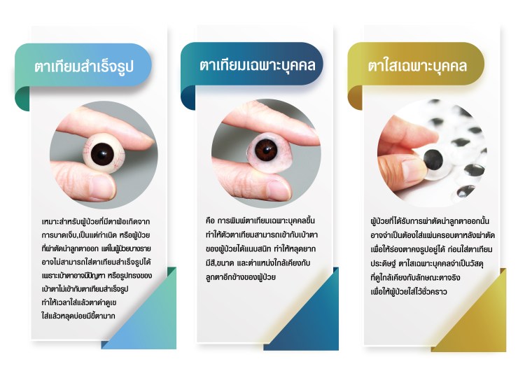 สำหรับผู้สูญเสียดวงตาหรือมีตาฝ่อ มีความสนใจที่จะประดิษฐ์ตาเทียมเฉพาะบุคคล ทางคณะแพทยศาสตร์ศิริราชพยาบาลมี “ศูนย์บริการตาเทียม” เพื่อให้คำปรึกษาและประดิษฐ์ตาเทียมเฉพาะบุคคล โดยทีมจักษุแพทย์ผู้ชำนาญการ มีบริการที่เกี่ยวข้องดังนี้