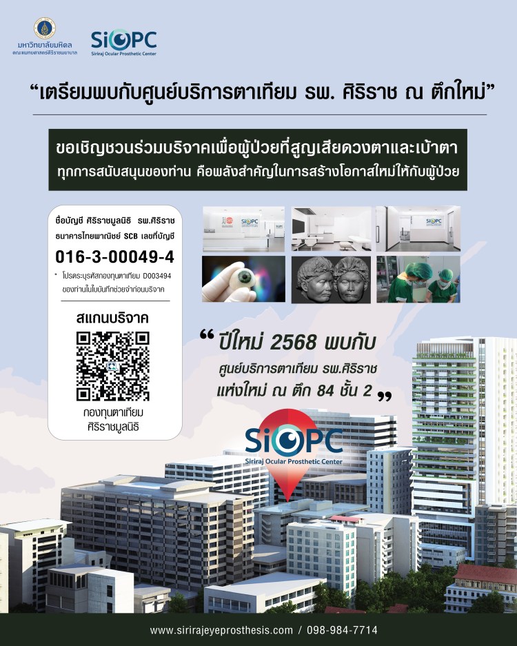 ศูนย์บริการตาเทียม รพ.ศิริราช เปิดบริการที่ตึก 84 ปี ชั้น 2 ผู้ป่วยที่มีนัดหมายแล้วสามารถนำใบนัดมายื่นที่ตึกสยามินทร์ ชั้น 1 ห้องเวชระเบียน 100 รอรับแฟ้มประวัติตนเอง และนำมายื่นที่ตึก 84 ปี ชั้น 2 เคาน์เตอร์ศูนย์บริการตาเทียม