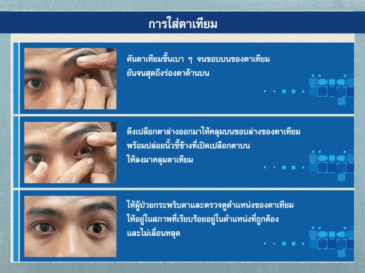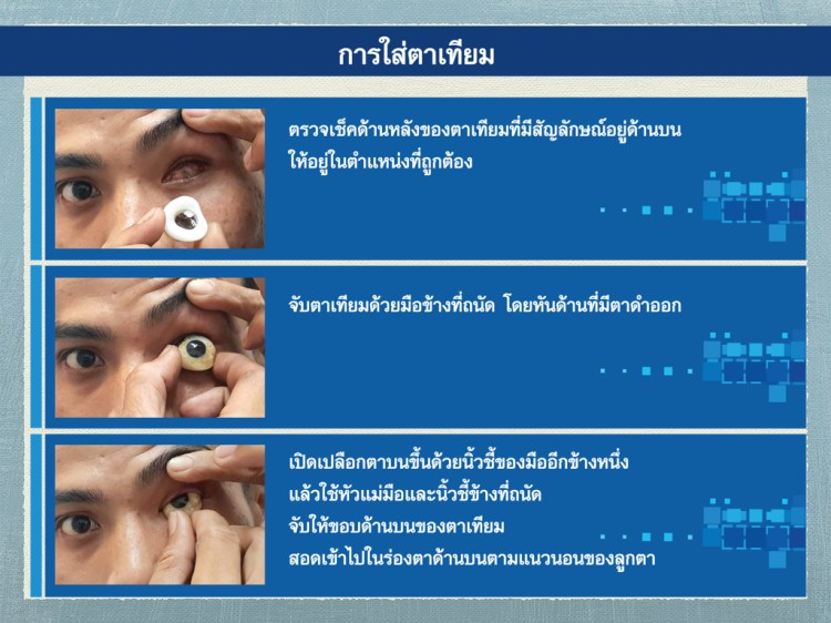 - ให้ผู้ป่วยกระพริบตาและตรวจดูตาเทียมให้อยู่ในตำแหน่งที่ถูกต้องและไม่เลื่อนหลุด