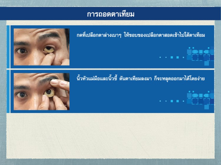 - ใช้นิ้วหัวแม่มือและนิ้วชี้ ดันตาเทียมลงมา ตาเทียมก็จะหลุดออกมาได้โดยง่เาย